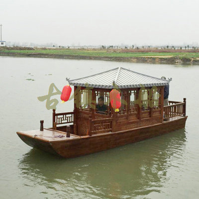 畫舫船就是裝飾古典華麗的游船,是"中國風(fēng)"的仿古游船,結(jié)合古典園林建筑,體現(xiàn)了中華文明的古典藝術(shù).畫舫船豪華而又古典,船上的建筑按照中國古代建筑里的亭臺樓閣,建筑工藝之復(fù)雜,要求之嚴(yán)格,仿古畫舫游船的特點(diǎn)飛檐翹角、玲瓏精致的四角亭子逐漸成形,赫然立于船頭,美人靠、盤龍柱子、彩畫……龍柱上的浮雕盤龍和祥云一層扣著一層,層層錯落有致,雕刻精細(xì)到盤龍身上的每一個鱗片都細(xì)細(xì)可數(shù),古代皇家標(biāo)志性元素,在畫舫船上體現(xiàn)的淋漓盡致。除了雕刻、花窗,整條船還有一個看點(diǎn),那就是弧線優(yōu)美、高高翹起的船尾。游船并不大,長約10米、寬3米,但是整體看起來堪稱一件藝術(shù)品。船尾的雕花欄桿與船艙、船頭的雕刻遙相呼應(yīng),船身四周貼著浮雕祥云,給整條船增添了富貴、華麗的氣質(zhì)。